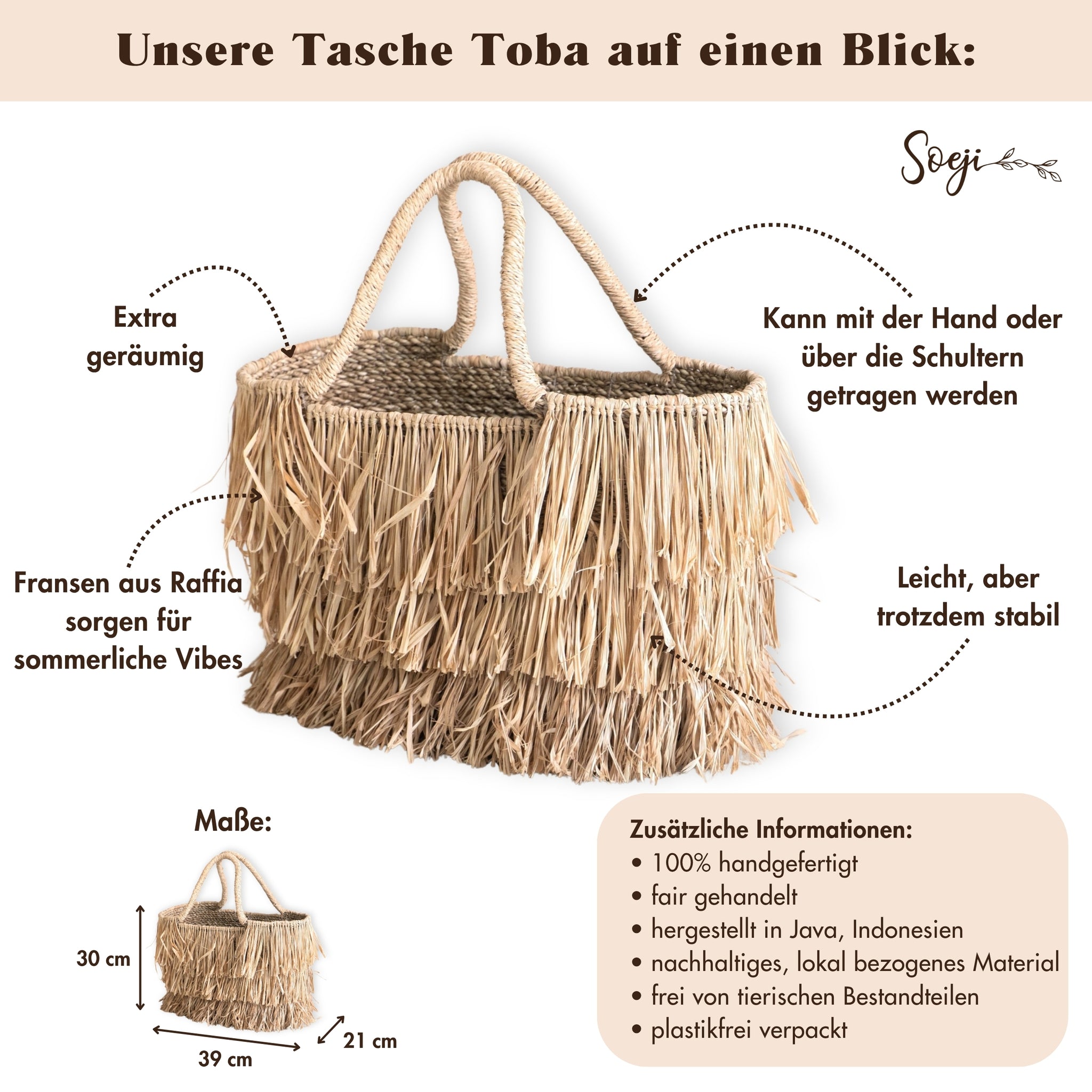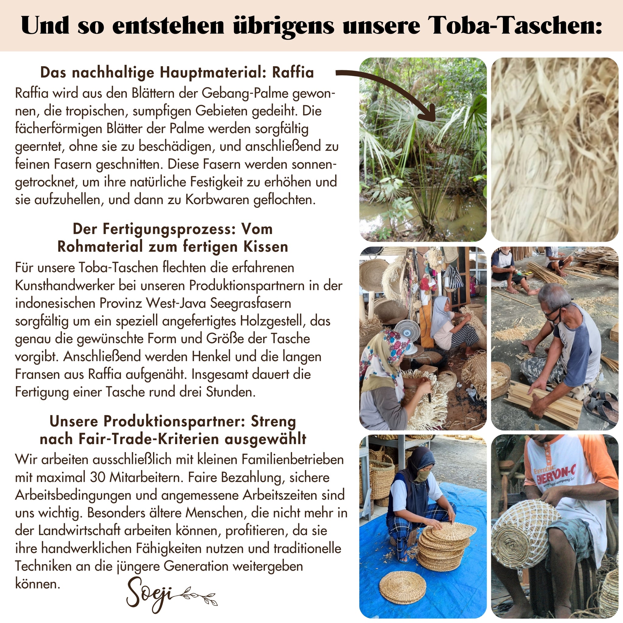 Handgefertigt auf Java aus nachhaltigem Raffia und Seegras, steht Toba für Qualität und Langlebigkeit. Das robuste Naturmaterial sorgt dafür, dass die Tasche ihre Form langfristig behält und allen Belastungen des Alltags trotzt. Gleichzeitig setzt du mit ihr ein nachhaltiges Fashion-Statement und unterstützt den Erhalt traditioneller Handwerkskunst sowie faire Arbeitsbedingungen für die Kunsthandwerker, die unsere Produkte kreieren.
